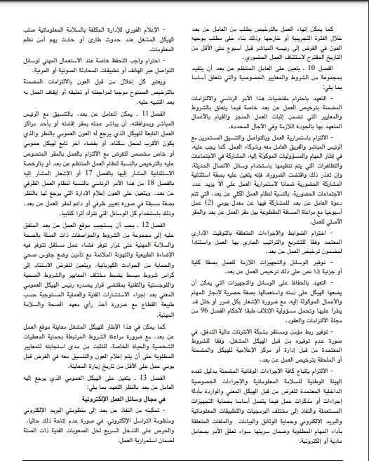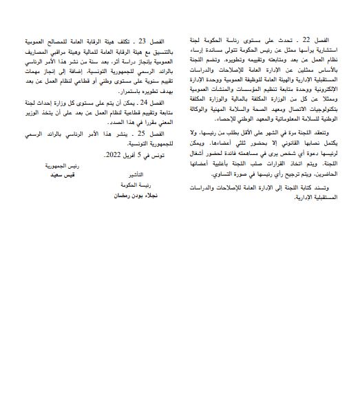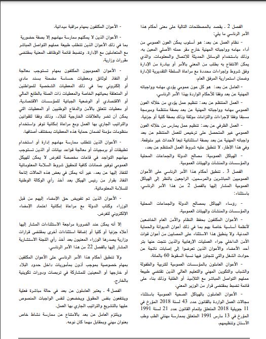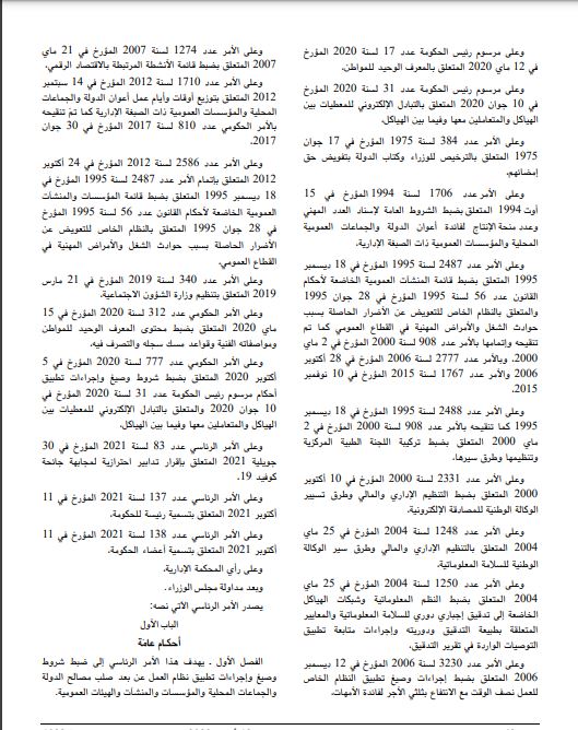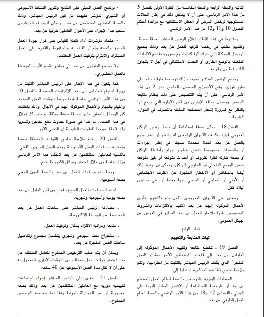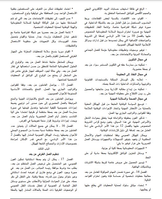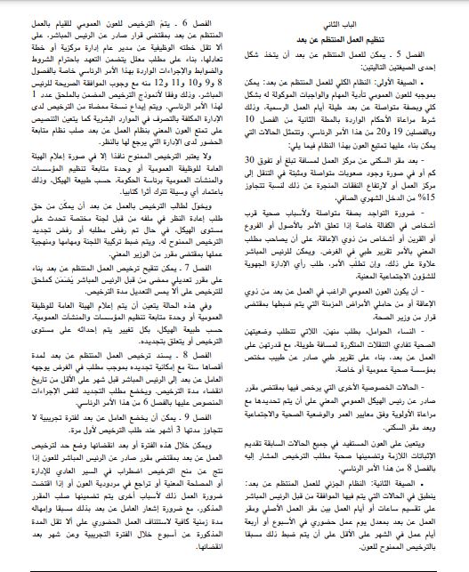 ويحتوي هذا الأمر الرئاسي على 25 فصلا موزعة على 4 أبواب وهي تباعا باب يتعلق بالأحكام العامة وباب تنظيم العمل المنتظم عن بعد وباب تنظيم العمل الظرفي عن بعد وباب آليات المتابعة والتقييم.