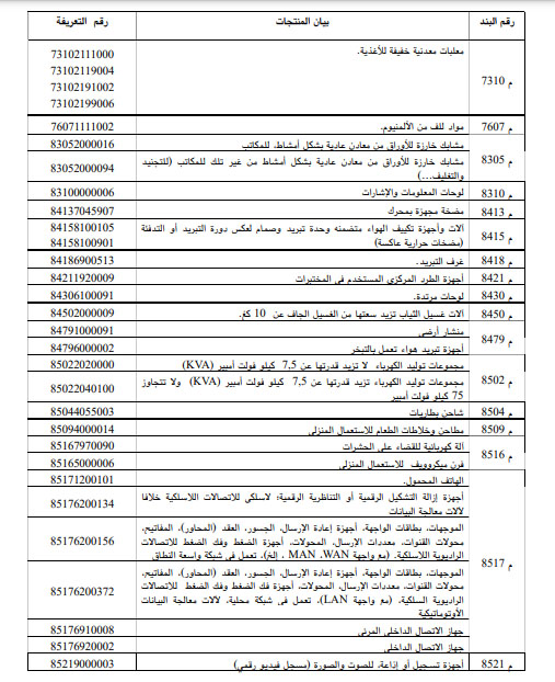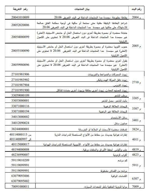 حيث نص الأمر المذكور على اعفاء المنتجات الآتي ذكرها والتي ليس لها مثيل مصنّع محليا من دفع المعاليم الديوانية من أبرزها الشاحنات ذات الاستعمال المهني والتي لا يزيد مقاعدها على ثلاثة باحتساب السائق والدراجات النارية التي لا تزيد سعة اسطوانتها عن 124 سم مكعب وأجهزة التسجيل وبعض المعدات الطبية وفيما يلي القائمة الكاملة: