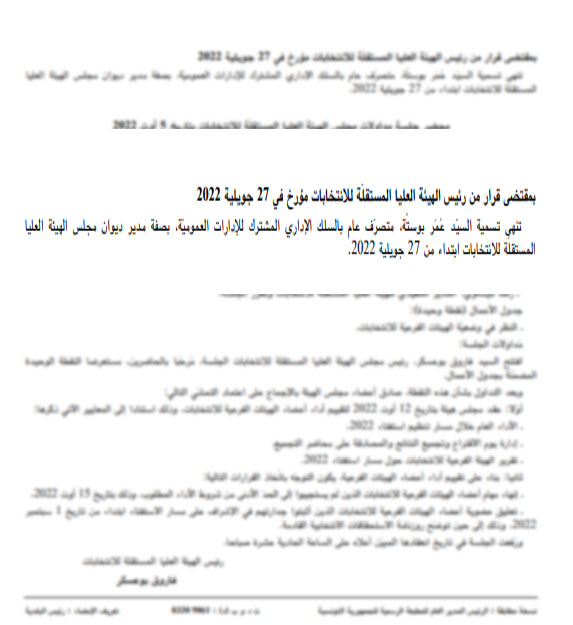 صدر بالعدد الأخير من الرائد الرسمي للجمهورية التونسية اليوم الثلاثاء 16 أوت 2022 قرار يقضي بإنهاء مهام مدير ديوان الهيئة العليا للانتخابات عمر بوستة ابتداء من يوكم 27 جويلية الماضي.
