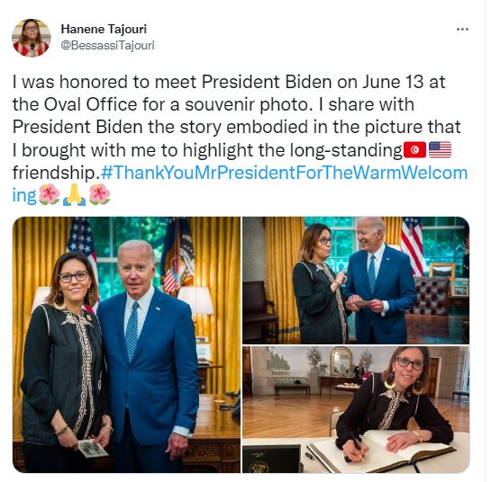 وقالت السفيرة في تغريدة على موقع التواصل الاجتماعي "تويتر" انها تشرفت بلقاء الرئيس الامريكي جو بايدن " كما نشرت صورا للقاء .