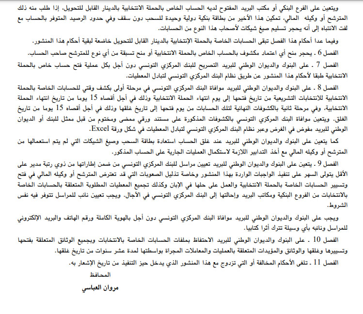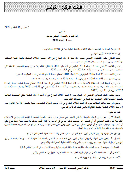 حيث لا يمكن لأي مترشح فتح اكثر من حساب واحد، وإطلاع البنك المركزي على كافة معطيات صاحبه أو وكيله.