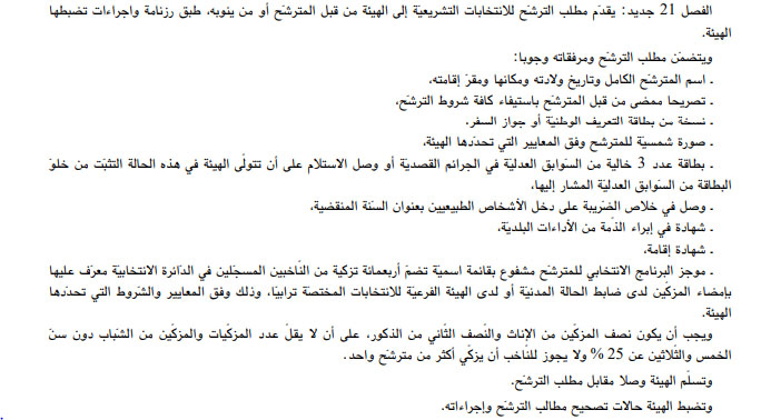 نص الفصل 21 من القانون الانتخابي الجديد الصادر بالعدد الأخير من الرائد الرسمي للجمهورية التونسية اليوم الجمعة 15 سبتمبر 2022 تخفيضا لعدد النواب بالبرلمان الجديد الذي سيتم انتخابه يوم 17 ديسمبر المقبل على وجوب أن يستظهر كل مترشح لهذا الاستحقاق الانتخابي بشهادة إبراء الذمة لدى المصالح الجبائية والبلدية (وصل خلاص الضريبة على الأشخاص الطبيعيين بعنوان السنة المنقضية وإبراء الذمة من الأداءات البلدية)، إلى جانب عريضة تزكية ممضاة من قبل 400 مواطن يقطنون بالدائرة الانتخابية، مع وجوب أن تكون الامضاءات معرفا بها لدى المصالح البلدية أو لدى الهيئة الفرعية للانتخابات المختصة ترابيا.