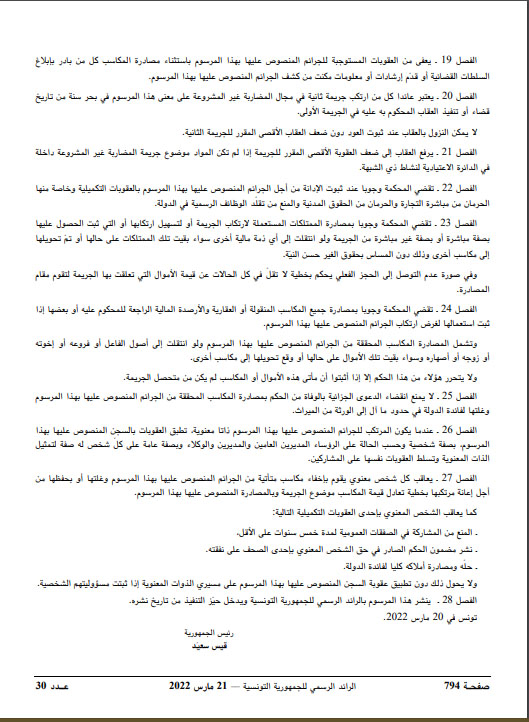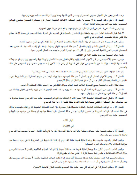 حيث نص هذا المرسوم على توقيع عقوبات تتراوج بين السجن لمدة 10 سنوات والغرامة بمائة ألف دينار ضد المخالفين وتضاعف العقوبة إذ ما تعلق الأمر بأدوية وسائر المواد الصيدلية أو تلك السلع المدعمة من ميزانية الدولة، وثلاثين سنة إلى جانب الغرامة بنصف مليار من المليمات عند ارتكاب المخالفة زمن الأزمات الصحية والكوارث والحالات الاستثنائية لتصل حد المؤبد إذا ما كان الغرض من تهريب المواد من قبل وفاق إجرامي بغرض تهريبها إلى الخارج، علما وأن العقوبات المشار إليها تسري على الشركاء والفاعلين الأصليين على حد سواء.