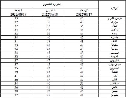 وفي يلي الجدول التفصيلي لدرجات الحرارة القصوى المنتظرة بمختلف الولايات: