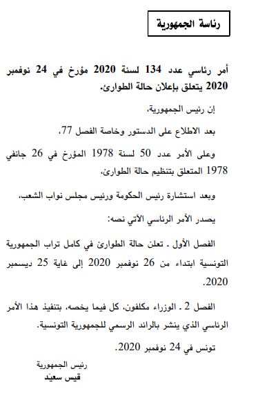 صدر بالعدد الأخير من الرائد الرسمي للجمهورية التونسية بتاريخ أمر رئاسي عدد 134 مؤرخ اليوم الثلاثاء 24 نوفمبر 2020 يقضي بالتمديد في حالة الطوارئ بداية من يوم الخميس 26 نوفمبر وإلى غاية الجمعة 25 ديسمبر 2020.