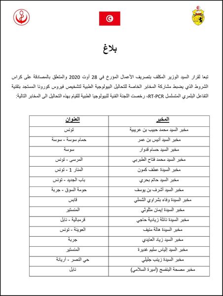 نشرت وزارة الصحة، في بلاغ اليوم الثلاثاء 24 نوفمبر 2020، قائمة المخابر الخاصة للتحاليل البيولوجية الطبية لتشخيص فيروس كورونا المستجد PCR، والتي رخصت لها اللجنة الفنية للبيولوجيا الطبية للقيام بهذه التحاليل إلى المخابر التالية: