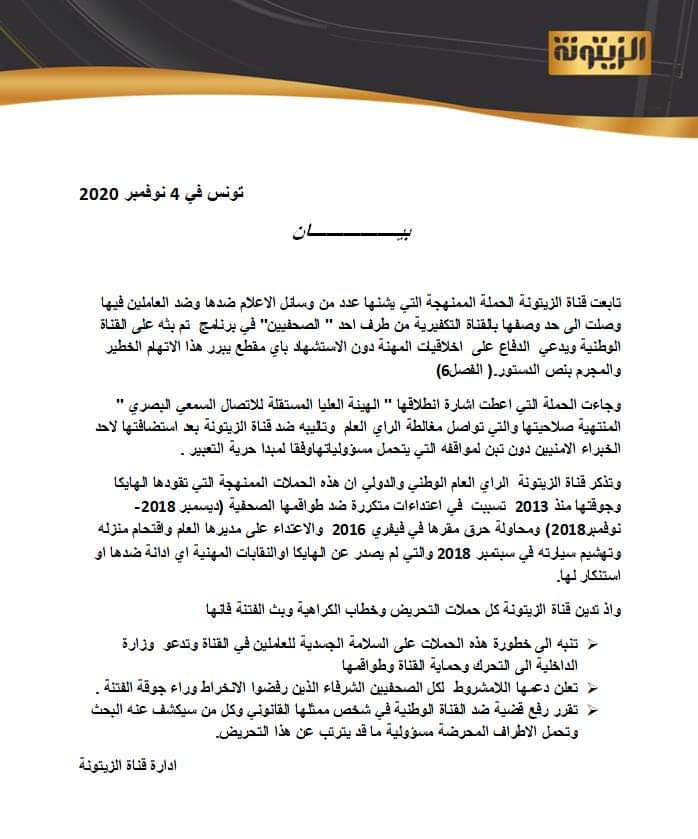 اعتبرت القناة في بيان لها اليوم ان الهيئة العليا المستقلة للاعلام السمعي البصري المنتهية صلاحيتها ”تواصل مغالطة الراي العام وتأليبه ضد قناة الزيتونة بعد استضافتها لاحد الخبراء الامنيين دون تبن لمواقفه التي يتحمل مسؤولياتهاوفقا لمبدا حرية التعبير”، حسب نص البيان.