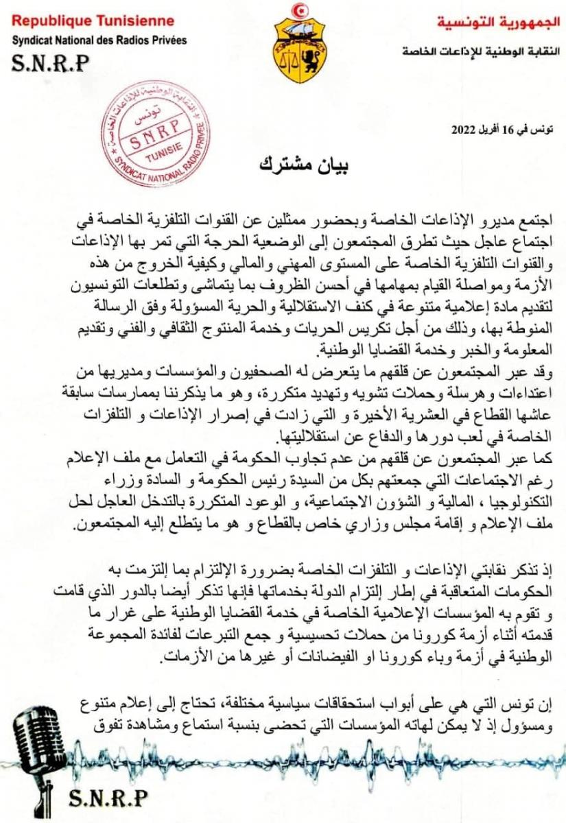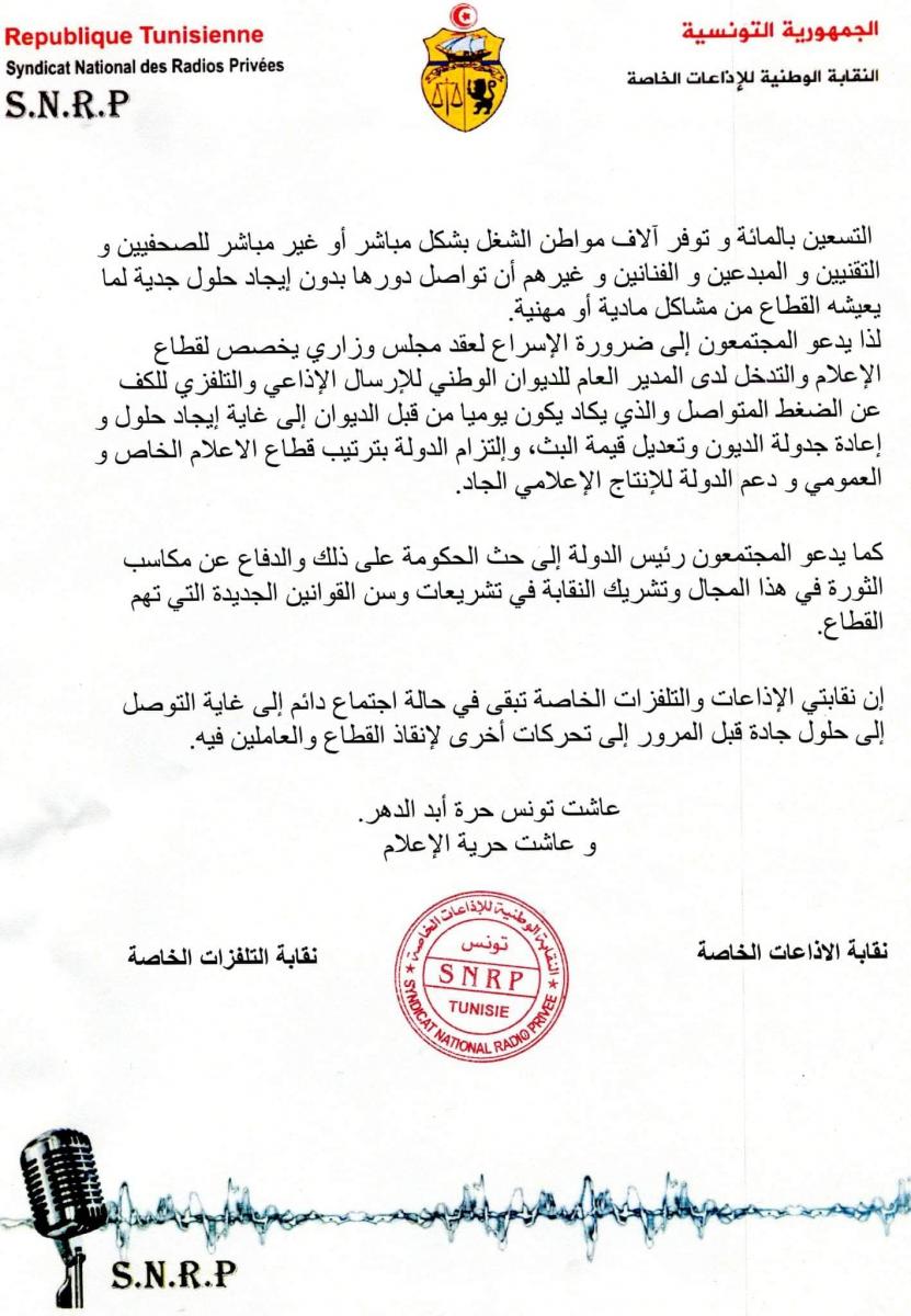 كما طالب المجتمعون الحكومة بالتدخل لدى المدير العام للديوان الوطني للارسال الإذاعي والتلفزي للكف عن الضغط المتواصل والذي يكاد يكون يوميا الى غاية ايجاد حلول واعادة جدولة الديون وتعديل قيمة البث وفق بيان مشترك صادر عن النقابة الوطنية للاذعات الخاصة ونقابة التلفزات الخاصة .