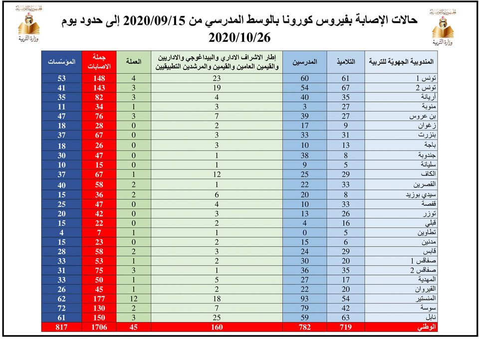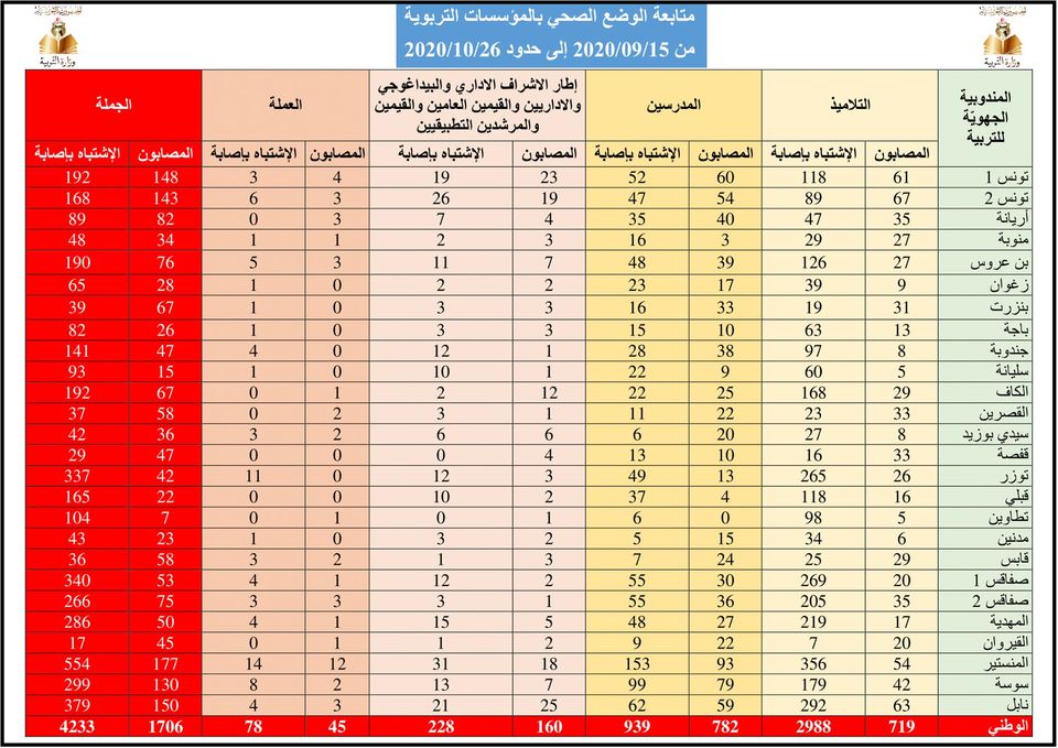 وفيما يلي الأرقام التي قدّمتها الوزارة والتوزيع الجغرافي للإصابات :