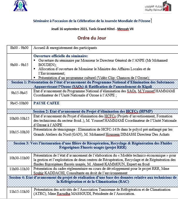 ويتضمّن البرنامج مداخلات حول مدى تقدّم البرنامج الوطني لإزالة المواد المستنفدة لطبقة الأوزون وخاصة منها بناء القدرات الوطنية في مجال التصرف الرشيد في سوائل التبريد الفليورية المستنفدة لطبقة الأوزون وذات القدرة المرتفعة للاحتباس الحراري، وعرض لتجارب ناجحة في هذا المجال بالإضافة إلى تقديم مشروع النموذج الاقتصادي والمالي المتعلق باستعادة ورسكلة وتدوير سوائل التبريد سالفة الذكر.