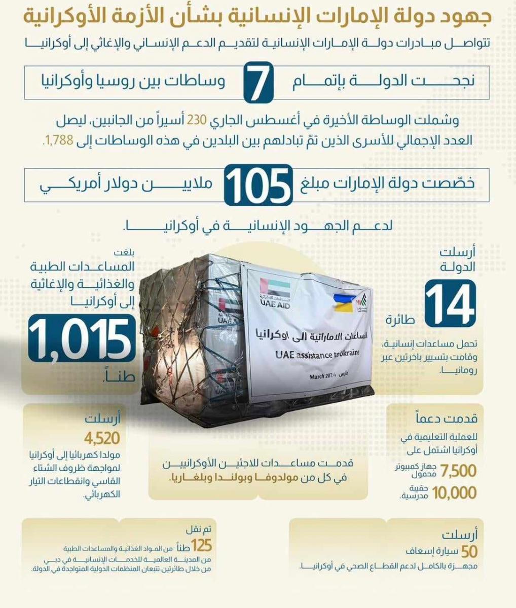 وفي إطار جهودها الإنسانية منذ بدء الأزمة في أوكرانيا، خصّصت دولة الإمارات مبلغ 105 ملايين دولار أمريكي لدعم الجهود الإنسانية في أوكرانيا، وأرسلت 14 طائرة تحمل مساعدات إنسانية، وقامت بتسيير باخرتين عبر رومانيا، فيما بلغت المساعدات الطبية والغذائية والإغاثية إلى أوكرانيا 1,015 طن، وأرسلت 50 سيارة إسعاف مجهزة بالكامل لدعم القطاع الصحي في أوكرانيا.