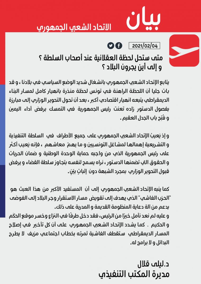 وقال الاتحاد الشعبي الجمهوري في بيان أصدره اليوم الخميس 4 فيفري 2021 أنه لم ''يعد يأمل خيرا من الرئيس'' بما أنه دخل طرفا في النزاع وخسر موقع الحكم والحكيم .