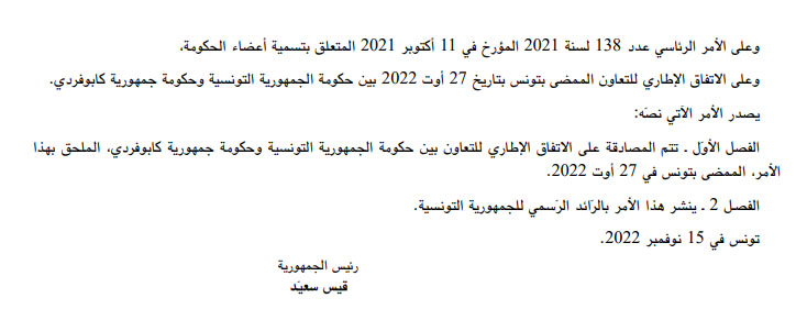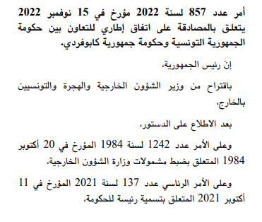 صدر بالعدد الأخير من الرائد الرسمي للجمهورية اليوم الجمعة 18 نوفمبر 2022 الأمر عدد 857 لسنة 2022 مؤرخ يوم 15 نوفمبر والمتعلق بالمصادقة على اتفاق إطار للتعاون بين الحكومة التونسية ونظيرتها بالرأس الأخضر (كابوفردي)