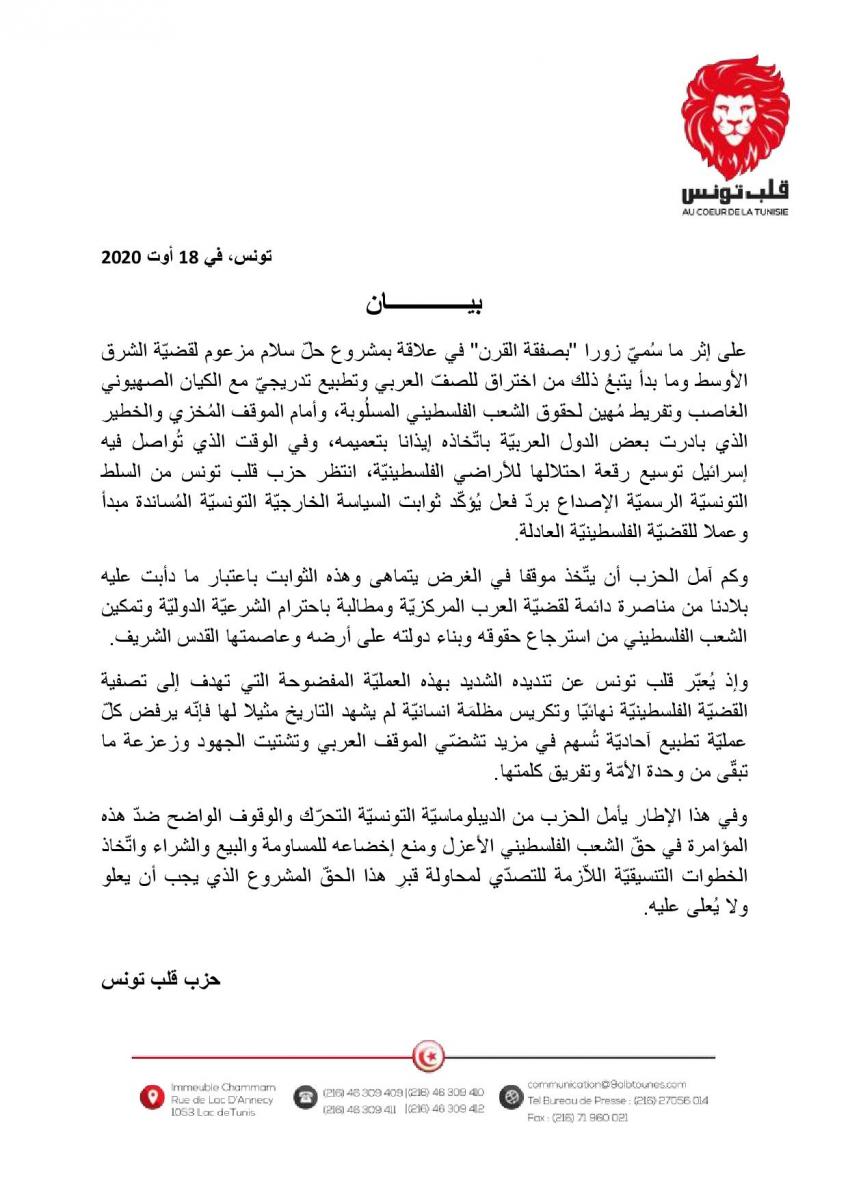 بناء على ذلك طالب الحزب الديبلوماسية التونسية باتخاذ موقف واضح صريح إزاء المؤامرة التي يتعرض لها الفلسطينيون عبر جرهم إلى مربع المساومة والتفريط في حقوقهم، مؤكدا في ذات السياق أن الحق يعلو ولا يعلى عليه.