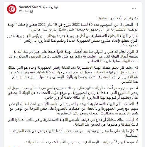 واوضح سعيّد في تدوينة نشرها على صفحته الرسمية على موقع التواصل الاجتماعي "اليوم الأحد 3 جويلية 2022 أن الرأي العام الداخلي و الدولي بما فيه أعضاء الهيئة كانوا جميعا على علم تام منذ البداية بطيعة أعمال الهيئة التي هي استشارية مثلما هو مبيّن بالفصل 2 من المرسوم المذكور. و قد قبلت الهيئة عملها على هذا الاساس.
