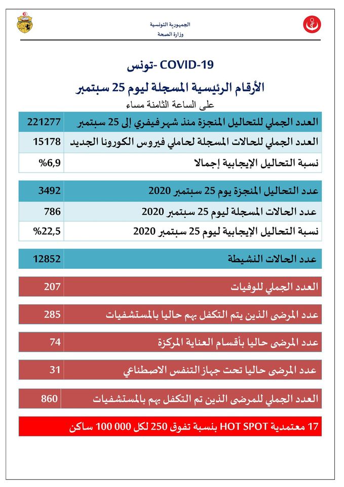يذكر أنّه، وبتاريخ 25 سبتمبر 2020، تمّ تسجيل 786 إصابة جديدة بفيروس كورونا المستجدّ من جملة 3492 تحليلا.