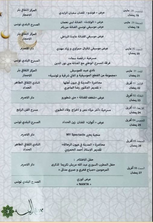 وحددت تذاكر الحفلات بـ 20 دينارا للعروض المبرمجة في فضاءات المدينة العتيقة وبـ 30 دينارا بالنسبة للعروض التي ستقام في المسرح البلدي ومسرح الأوبيرا ومسرح الجهات بمدينة الثقافة.