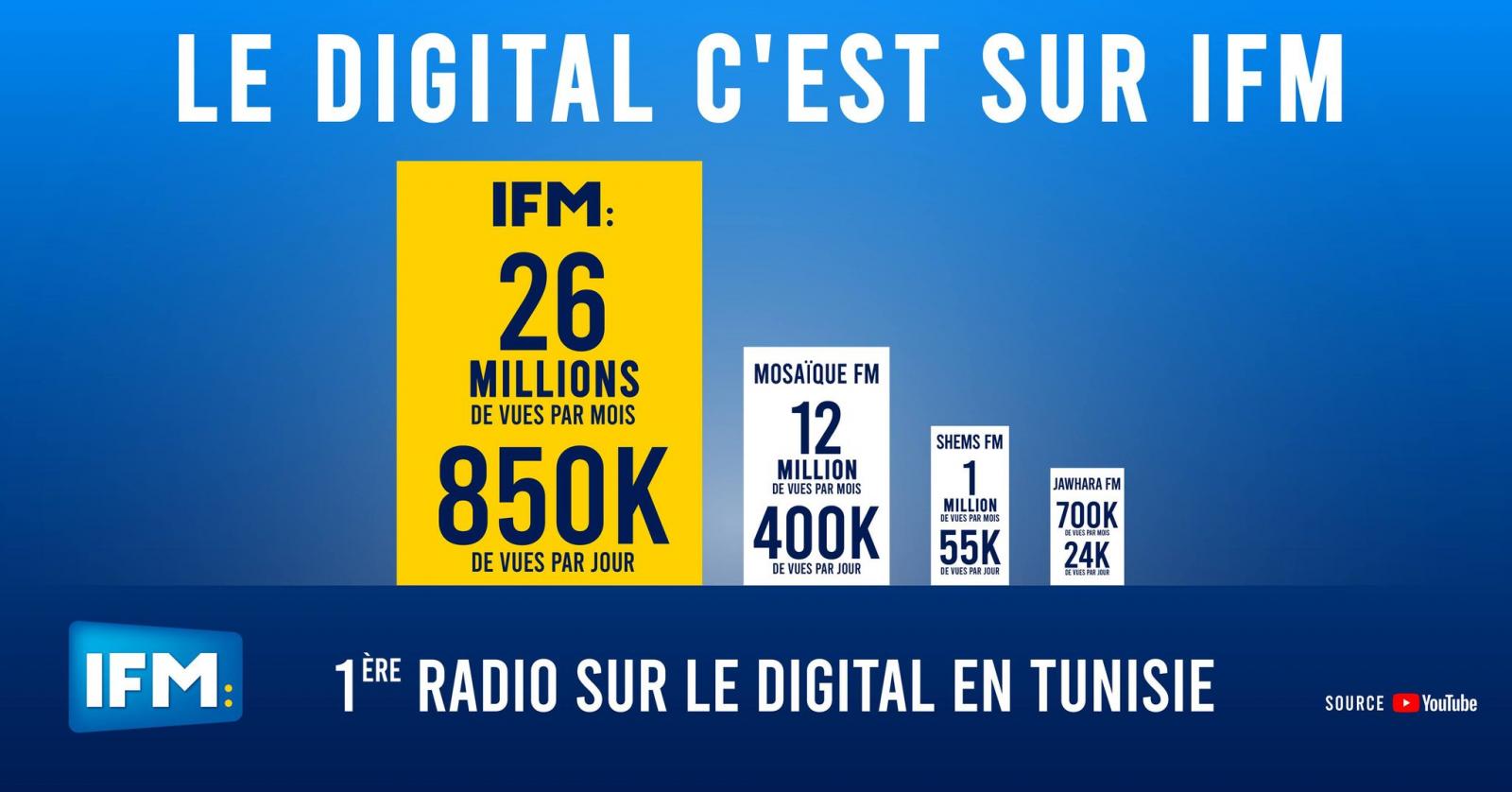 IFM التي استعادت بقوة نشاطها الرقمي على منصة يوتيوب منذ سنتين فقط واضافت البث المباشر 24 ساعة /24 منذ 20 مارس 2020 تصدرت في سنتين ترتيب الإذاعات التونسية والخامسة على مجمل وسائل الإعلام