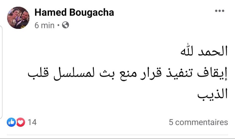 وكان حامد بوقشة أحد منتجي العمل الدرامي التونسي قد أعلن عبر صفحته في وقت سابق من صباح اليوم عن إيقاف تنفيذ الحكم الصدر من المحكمة الإبتدائية والقاضي بمنع بث المسلسل على القناة الوطنية.