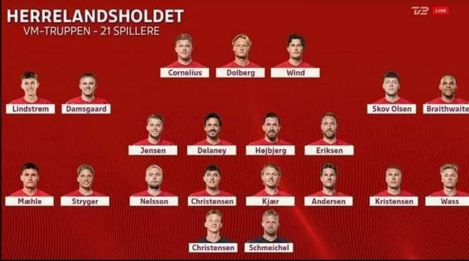 وضمت تشكيلة منتخب الدنمارك 21 لاعبا، في انتظار حسم أموره باختيار 5 لاعبين آخرين في موعد أقصاه يوم الإثنين المقبل ليصبح عدد اللاعبين في التشكيلة 26 لاعبا.