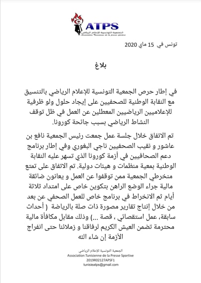 بسبب توقف النشاط الرياضي جراء جائح. فيروس كورونا، تم الاتفاق خلال جلسة عمل جمعت رئيس الجمعية نافع بن عاشور و نقيب الصحفيين ناجي البغوري استنادا إلى برنامج دعم الصحافيين في أزمة كورونا الذي تسهر على تنفيذه النقابة الوطنية بمعية منظمات وهيئات دولية، على تمتع منخرطي الجمعية ممن توقفوا عن العمل و يعانون ضائقة ماليةمن تبعات ذك بتكوين خاص يتواصل لثلاثة أيام قبل الانخراط في برنامج خاص للعمل الصحفي عن بعد من خلال إنتاج تقارير مصورة ذات (صلة بالرياضة (أحداث سابقة، عمل استقصائي ، قصة ...) وذلك مقابل مكافأة مالية محترمة تضمن العيش الكريم لمنتسبي الاعلام الرياضي حتى انفراج الأزمة إن شاء الله.