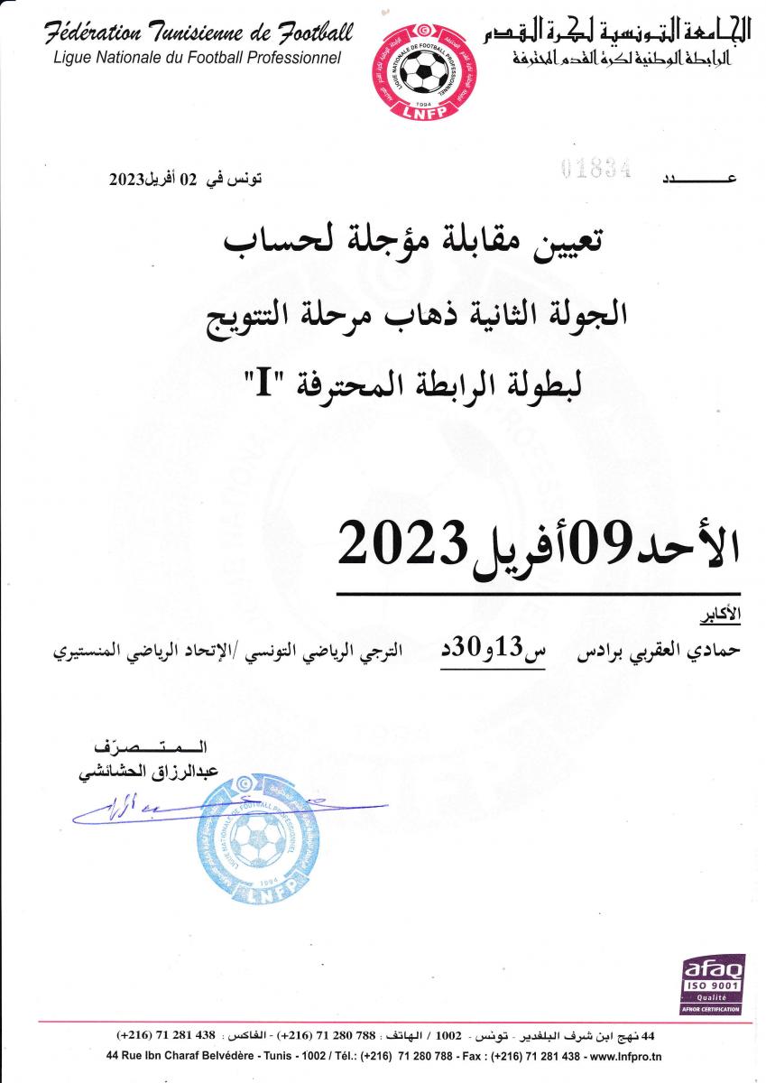 أعلنت الرابطة الوطنية لكرة القدم المحترفة اليوم الأحد 2 أفريل 2023 عن موعد المباراة المتأخرة التي ستجمع الترجي الرياضي بالاتحاد الرياضي المنستيري لحساب ثاني جولات مرحلة المنافسة على اللقب (البلاي أوف) بملعب حمادي العقربي برادس، انطلاقا من الساعة الواحدة والنصف بعد الظهر.