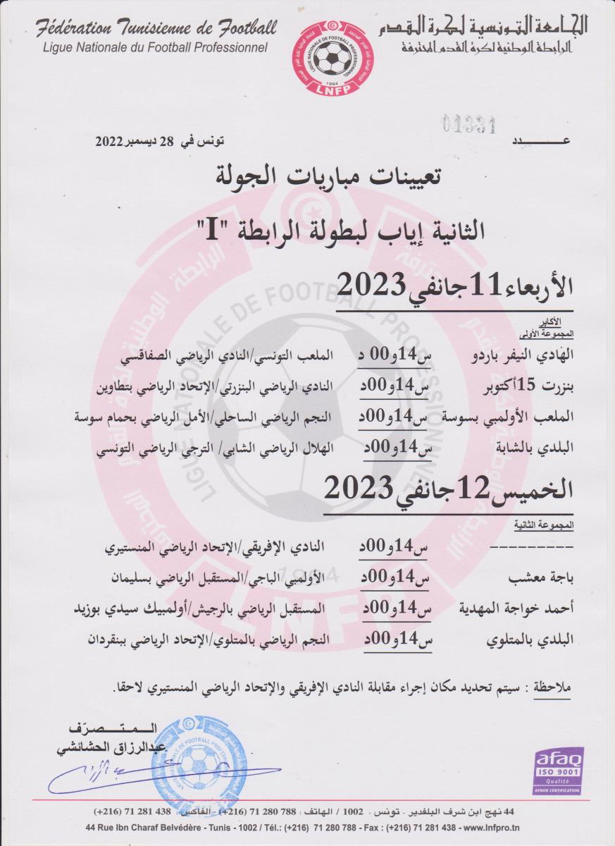 أعلنت الرابطة الوطنية لكرة القدم المحترفة في بلاغ لها اليوم الجمعة 06 جانفي 2023 عن إلغاء تعيينات الجولتين الأولى والثانية من مرحلة إياب بطولة الرابطة المحترفة الأولى لكرة القدم تبعا لقرار التعهد من قبل المكتب الجامعي، يذكر أن الجولتين المشار إليهما كانا من المفترض إقامتهما يوما 7و8 و11 و12 جانفي الجاري.