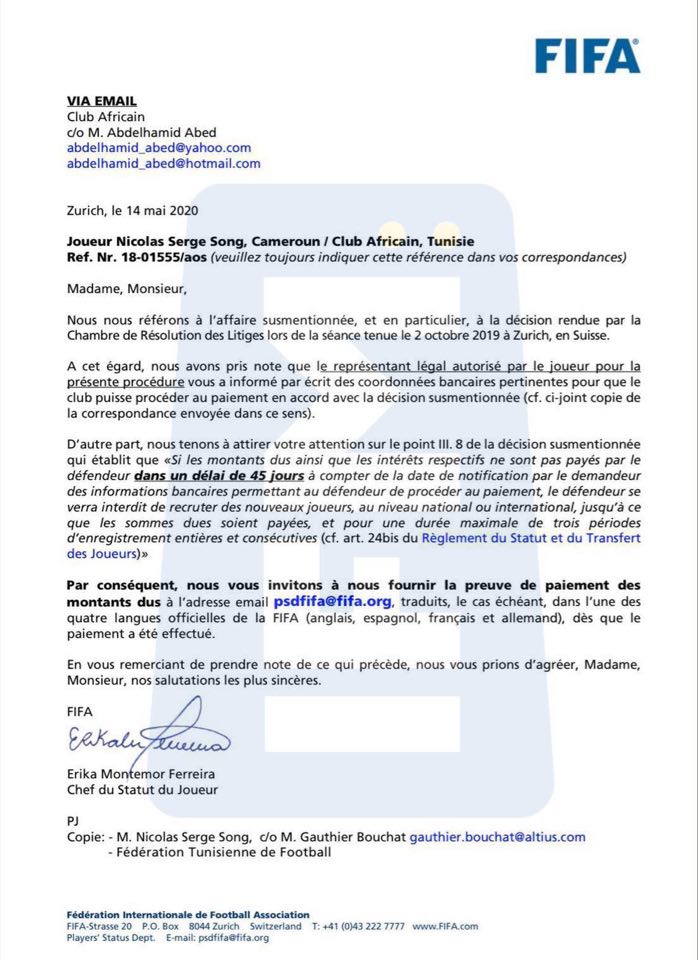 و للاشارة فان هيئة اليونسي كانت قد راسلت لجنة النزاعات في الفيفا شهر مارس الفارط أكّدت من خلالها توصلها لاتفاق ودّي مع اللاعبين مقابل تمكنيهما من تعويض مالي قدره 100 ألف أورو و هو ما نفاه محامي اللاعبين متهّما هيئة اليونسي بتزوير الوثائق .