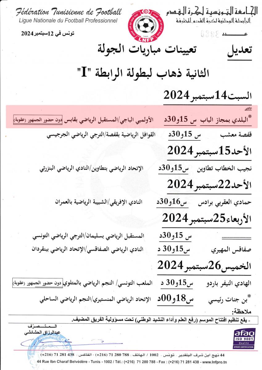 أعلنت الرابطة الوطنية لكرة القدم المحترفة اليوم الخميس 12 سبتمبر 2024 عن تعيين مباراة الأولمبي الباجي ومستقبل قابس لحساب الجولة الثانية ذهابا من بطولة الرابطة المحترفة الأولى بالملعب البلدي بمجاز الباب دون حضور الجمهور بعد غد السبت، وذلك بموجب العقوبة المسلطة على الأولمبي من قبل لجنة التأديب والروح الرياضية بالجامعة في لقاء نصف نهائي الموسم الماضي ضد الملعب التونسي، والقاضية بحرمانه من حضور أنصاره في ثلاث لقاءات، وفيما يلي تذكير ببرنامج بقية الجولة: