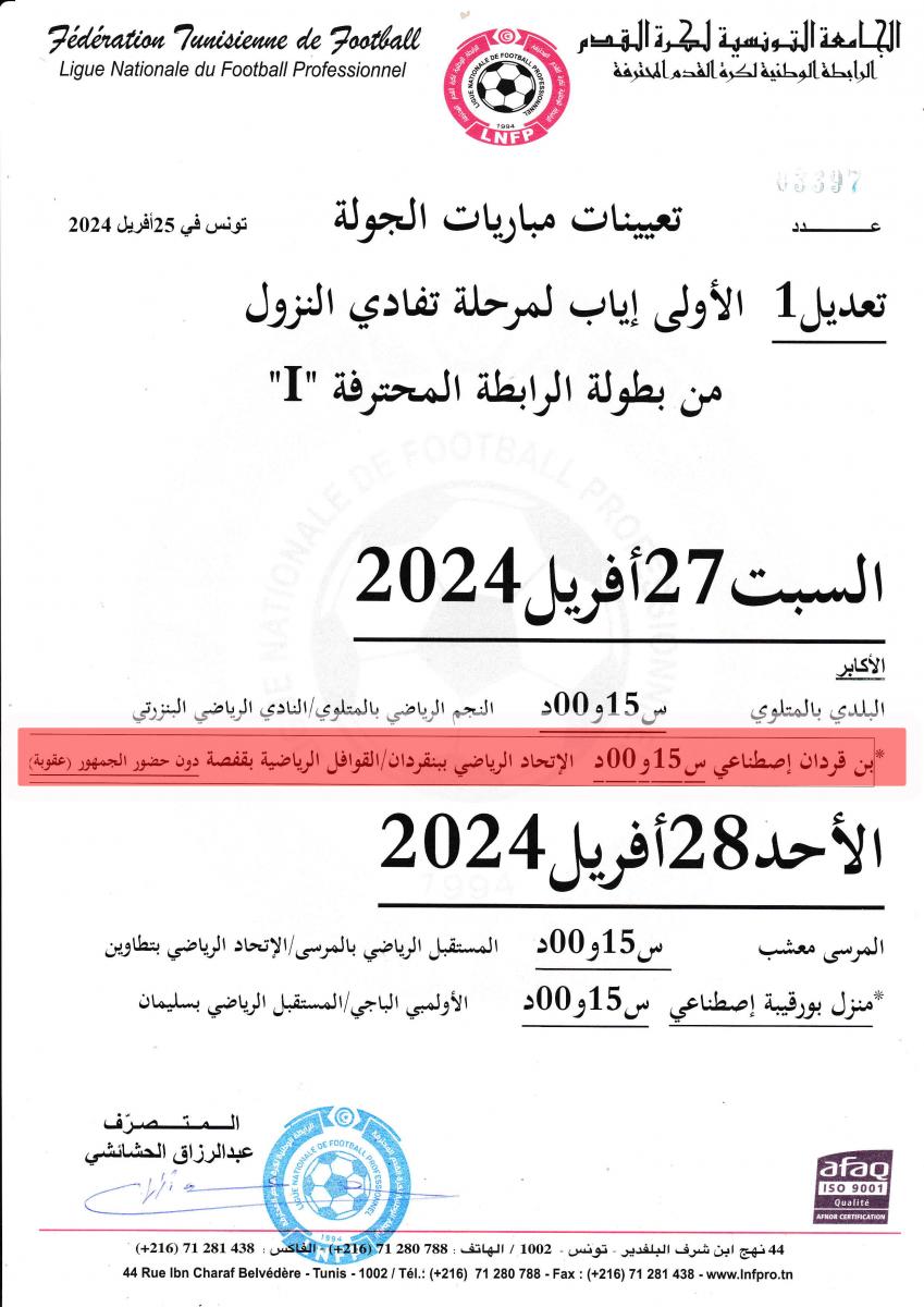 ليجري الفريق مباراته المقبلة مع القوافل الرياضية بقفصة لحساب الجولة الأولى إيابا من مرحلة تفادي النزول ''ويكلو'' وفيما يلي البرنامج الجديد للجولة: