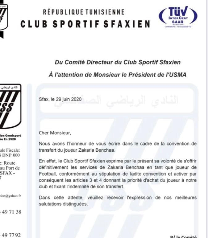 *مراسلة النادي الصفاقسي بخصوص بن شاعة لفريقه الجزائري