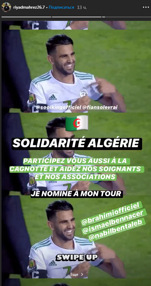 واستجاب قائد منتخب "محاربي الصحراء" لطلب ابن مدينة سطاوالي الجزائرية الذي أطلقه على موقع التواصل الاجتماعي "إنستغرام" تحت شعار تضامن مع الجزائر.