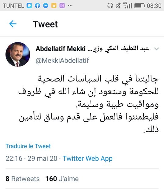 طمأن وزير الصحة عبد اللطيف المكي في تغريدة على موقع تويتر ، اليوم السبت 30 ماي 2020 الجالية التونسية المقيمة بالخارج أنها في قلب السياسات الصحية للحكومة.