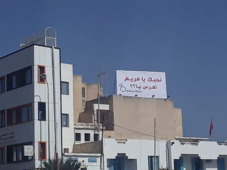 تداول رواد موقع التواصل الاجتماعي فايسبوك ، اليوم الجمعة 25 سبتمبر 2020، صورة لافتة معلقة في أحد الأسطح ، قيل إنها لشاب تونسي في حمام سوسة ، وجد الحل واختار طريقة جديدة ومبتكرة للتقدم لفتاة وطلب يدها وكتب عليها '' نحبك يا مريم تعرس بيا '' في انتشار فيروس كورونا في كامل البلاد .