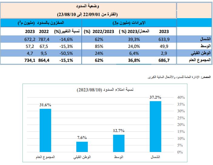 أكد المرصد الوطني للفلاحة من خلال نشريته لشهر اوت 2023، أن الإيرادات الجملية للسدود تراجعت لتبلغ 7ر686 مليون متر مكعب الى غاية يوم 10 اوت الجاري، مقارنة مع الايرادات المسجلة خلال معدل الفترة (4ر1864 مليون متر مكعب) والايرادات المسجلة خلال نفس الفترة من السنة المنقضية والمقدرة ب 4ر1099 مليون متر مكعب.