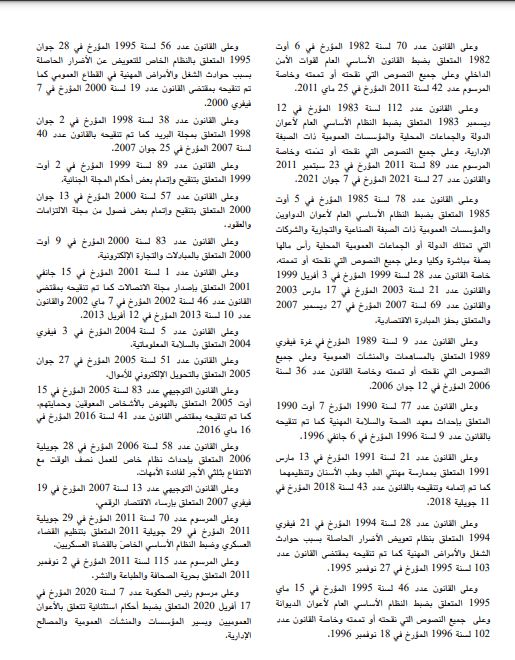 ويحتوي هذا الأمر الرئاسي على 25 فصلا موزعة على 4 أبواب وهي تباعا باب يتعلق بالأحكام العامة وباب تنظيم العمل المنتظم عن بعد وباب تنظيم العمل الظرفي عن بعد وباب آليات المتابعة والتقييم.