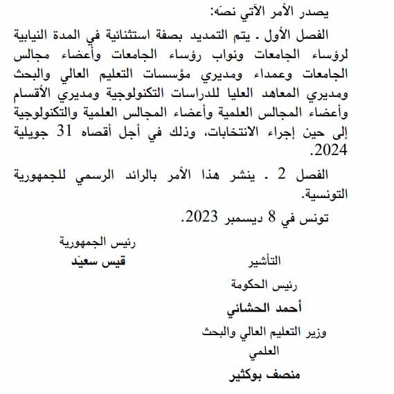 صدر بالعدد الأخير من الرائد الرسمي للجمهورية التونسية اليوم الجمعة 8 ديسمبر 2023 الامر عدد 759 لسنة 2023 مؤرخ يوم 8 ديسمبر والقاضي بالتمديد بصفة استثنائية في المدد النيابية لكل: رؤساء الجامعات ونواب رؤساء الجامعات وأعضاء مجالس الجامعات وعمداء ومديري مؤسسات التعليم العالي والبحث ومديري المعاهد العليا للدراسات التكنولوجية ومديري الأقسام وأعضاء المجالس العلمية والتكنولوجية إلى حين إجراء الانتخابات وذلك في أجل أقصاه 31 جويلية 2024.
