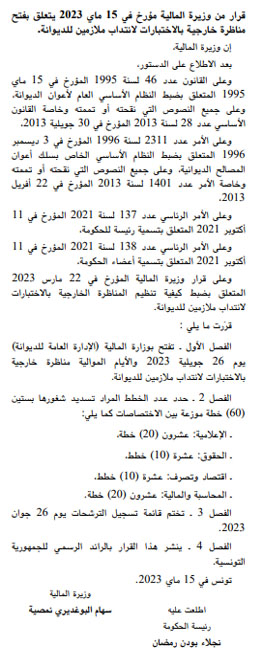 صدر بالعدد الأخير من الرائد الرسمي للجمهورية التونسية اليوم الجمعة 19 ماي 2023 قراران لوزيرة المالية يتعلقان بفتح باب التناظر من أجل انتداب ملازمين أول وملازمين وذلك يوم الأربعاء 26 جويلية المقبل والأيام الموالية.