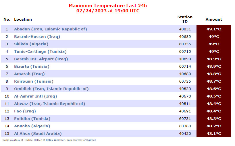 كشف موقع ''إلدورادو ويذر'' المختص في متابعة حالة الطقس لليوم الاثنين 24 جويلية 2023 عن تسجيل العاصمة التونسية لثاني أرفع درجة حرارة في العالم (49 درجة مائوية) خلف كل من مدينة عبدان الإيرانية (49.1)، وبالشراكة مع البصرة العراقية وسكيكدة الجزائرية. .