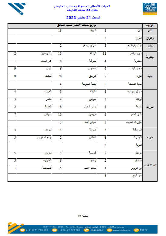 نشر المعهد الوطني للرصد الجوي اليوم السبت 21 جانفي، القائمة الأولية لكميات الأمطار التي تم تسجيلها خلال الـ 24 ساعة الماضية.