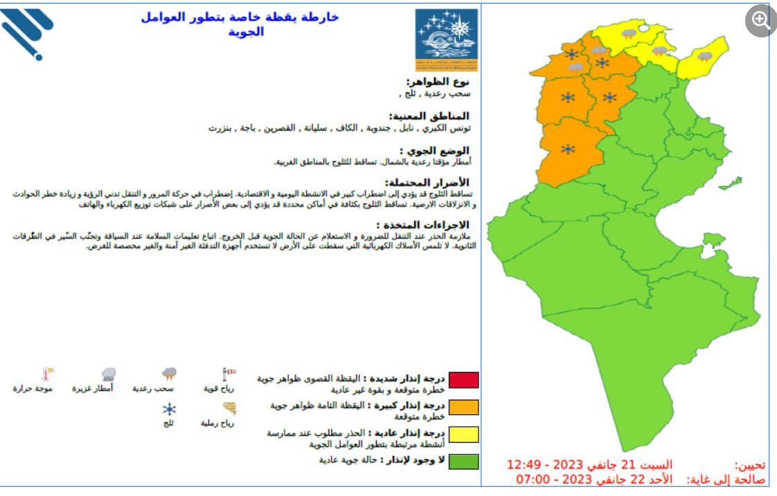 أعلن المعهد الوطني للرصد الجوي اليوم السبت 21 جانفي، إسناد اللون البرتقالي لولايات باجة وجندوبة وسليانة والكاف والقصرين، في خارطة اليقظة المؤمنة بالموقع الرسمي للمعهد الوطني للرصد الجوي.