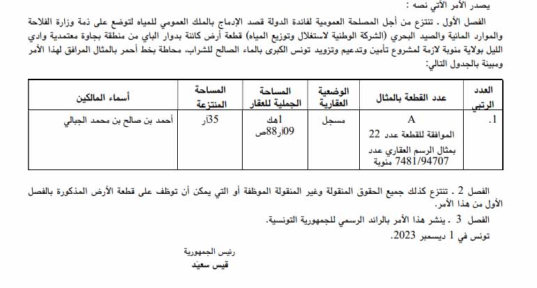 صدر بالعدد الأخير من الرائد الرسمي للجمهورية التونسية الأمر عدد 744 لسنة 2023 مؤرخ يوم 1 ديسمبر يتعلق بالانتزاع للمصلحة العامة لقطعة أرض بدوار الباي من منطقة بجاوة معتمدية وادي الليل بولاية منوبة تمسح 35 آر، لازمة لمشروع تأمين وتدعيم وتزويد تونس الكبرى بالماء الصالح للشراب، لتوضع على ذمة وزارة الفلاحة والموارد المائية (الشركة الوطنية للاستغلال وتوزيع المياه).