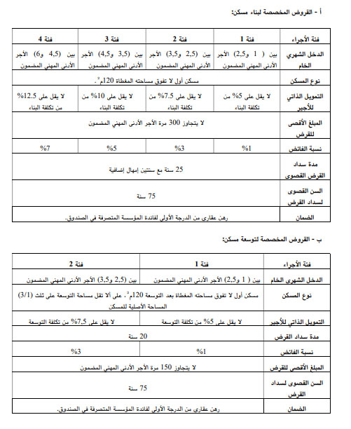 هذا القروض بنسب فائدة تتراوح بين 1 و7 بالمائة ومدة سداد لـ25 سنة مع فترة إمهال لسنتين.