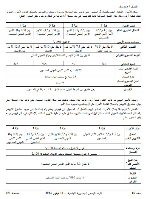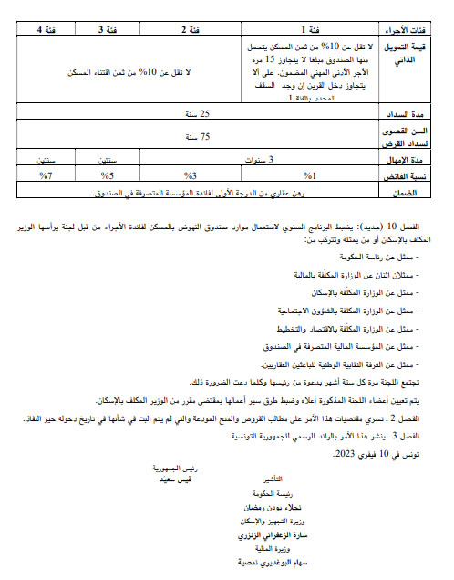 صدر بالعدد الأخير من الرائد الرسمي للجمهورية التونسية اليوم الثلاثاء 14 فيفري 2023 الأمر عدد 127 لسنة 2023 مؤرخ يوم 10 فيفري والمتعلق بضبط صيغ وشروط تدخلات صندوق النهوض بالمسكن لفائدة الأجراء، تتراوح قيمة مرتباتهم الشهرية بين مرة واحدة الأجر الأدنى المضمون خام (430 دينارا) و6 مرات (أي تقريبا 2600 دينارا).