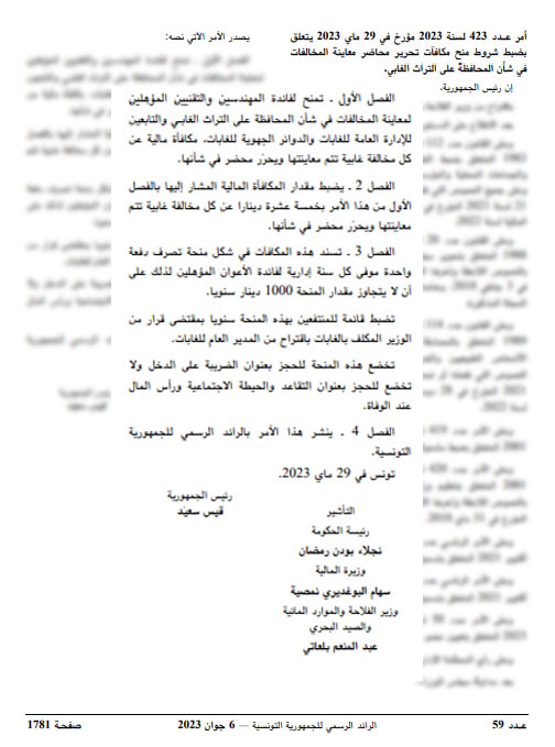 صدر بالعدد الأخير من الرائد الرسمي للجمهورية التونسية اليوم الثلاثاء 06 جوان 2023 الأمر عدد 423 لسنة 2023 مؤرخ يوم 29 ماي ينص على منح المهندسين والتقنيين المؤهلين لمعاينة المخالفات في شأن المحافظة على التراث الغابي والتابعين للإدارة العامة للغابات والدوائر الجهوية للغابات مكافأة مالية قدرها 15 دينارا عن كل مخالفة يتم معاينتها وتحرير مخالفة في شأنها.