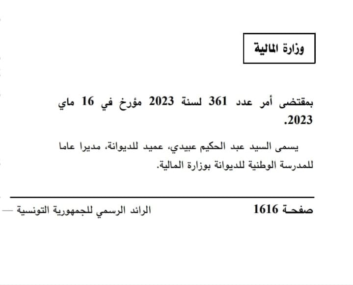صدر بالرائد الرسمي عدد 52 بتاريخ اليوم الجمعة 19 ماي 2023 الأمر عدد 361 لسنة 2023 المؤرخ في16ماي 2023، المتعلق بتسمية العميد للديوانة عبد الحكيم عبيدي مديرا عاما للمدرسة الوطنية للديوانة بوزارة المالية.