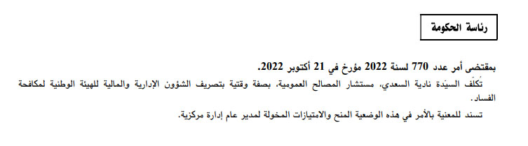 صدر بالعدد الأخير من الرائد الرسمي للجمهورية التونسية اليوم الجمعة 28 أكتوبر 2022 الأمر عدد 770 لسنة 2022 مؤرخ يوم 21 أكتوبر والقاضي بتكليف نادية السعدي بتصريف الشؤون المالية والإدارية للهيئة الوطنية لمكافحة الفساد بصفة وقتية، مع تمتيعها بالمنح الامتيازات المخولة لمدير عام إدارة مركزية.