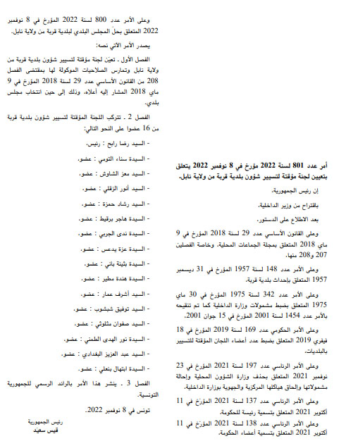 صدر بالعدد الأخير من الرائد الرسمي للجمهورية التونسية الأمر عدد 800 لسنة 2022 مؤرخ يوم 8 نوفمبر القاضي بحل المجلس البلدي بمعتمدية قربة من ولاية نابل، هذا الأمر ارتكز إلى تقرير الوالية مؤرخ يوم 29 جوان الفارط يثبت وجود تعطيل مصالح المواطنين من جراء التجاذب بين أعضائه واستحالة اعتماد حلول أخرى.