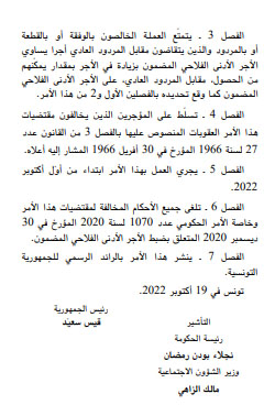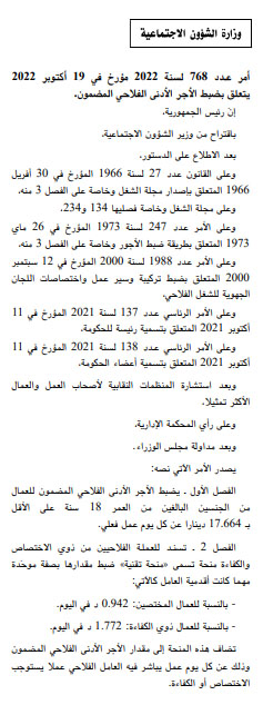 صدر بالعدد الأخير من الرائد الرسمي للجمهورية التونسية اليوم الجمعة 21 أكتوبر 2022 الأمر الرئاسي عدد 768 مؤرخ يوم 19 أكتوبر 2022 ويتعلق بتحديد الأجر الأدنى الفلاحي المضمون.