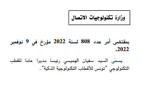 صدر بالعدد الأخير من الرائد الرسمي للجمهورية التونسية اليوم الجمعة 11 نوفمبر 2022 الأمر عدد 808 لسنة 2022 مؤرخ يوم 9 نوفمبر يقضي بتسمية سفيان الهميسي رئيسا مديرا عاما للقطب التكنولوجي، تونس للأقطاب التكنولوجية الذكية،